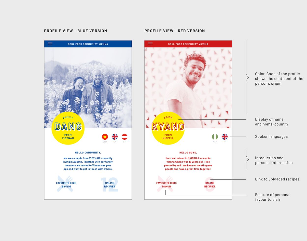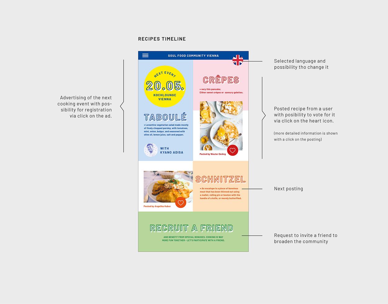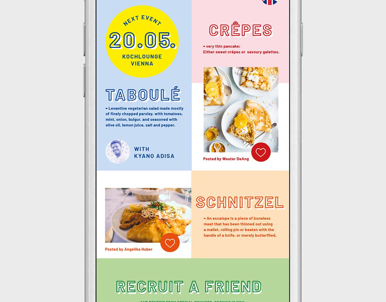 With the aim of creating a project that could help connecting migrants and Austrians, we developed a concept for cultural exchange through food. It includes a mobile app / website where people can share their favourite recipes from their culture as well as cooking get-togethers in community-oriented events in the public space.