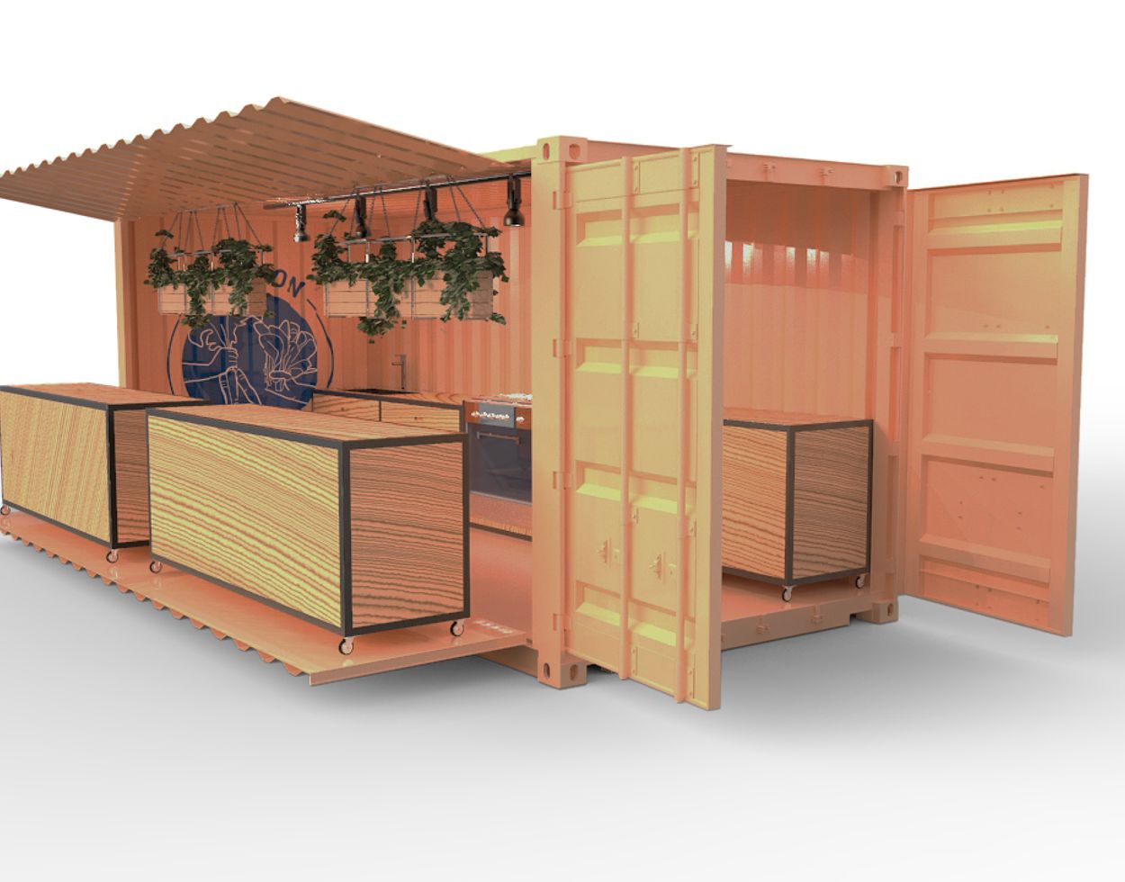 When the container is opened and placed, you can find boxes with caster wheels under them which enable movement of the boxes. The boxes can then be rolled on the surface of the folding door. The top of the box then serves as kitchen table.