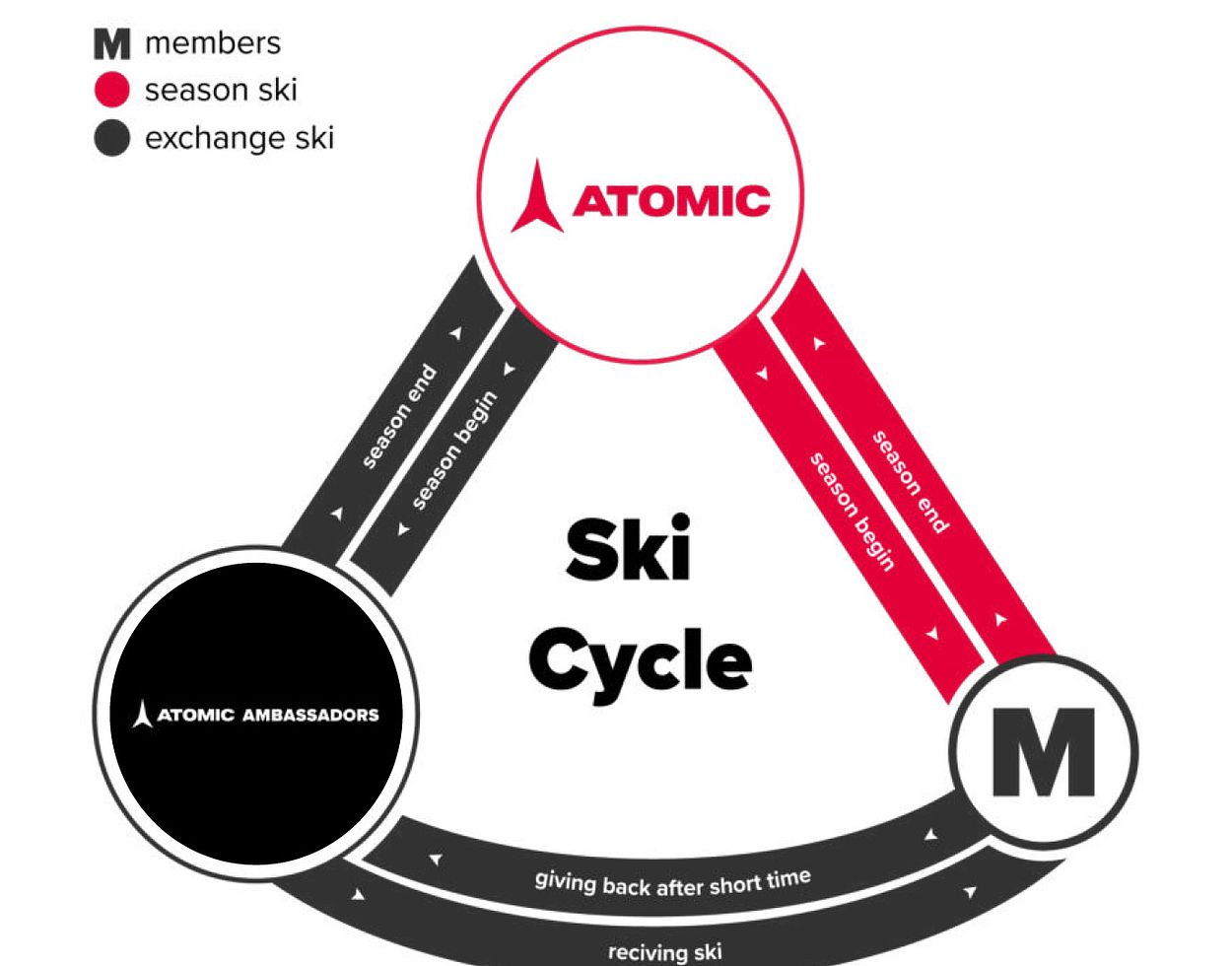 Global player and Austria based ski manufacturer Atomic briefed students of the Master Programme with the task to develop concepts for a more sustainable skiing adventure of the future. Thus Atomic intensively increases their efforts to provide a more eco-friendly sporting experience. One of the possible ways to decrease waste and impact of sporting goods is the concept of sharing economy. The featured student team used an in-depth field research to ask skiers about the circumstances that can increase the interest in sharing sports equipment. The led to a result called "Atomic Ambassadors". This exclusive club provides its members with equipment and information which are not available elswhere. It consists of an entire customer journey with touchpoints as the service of delivery/collection of the lent equipment, easy and quick ski swap depending on the type of ski holiday, exclusive skiing gear, an app with recorded ski data and a network of other club members and much more.