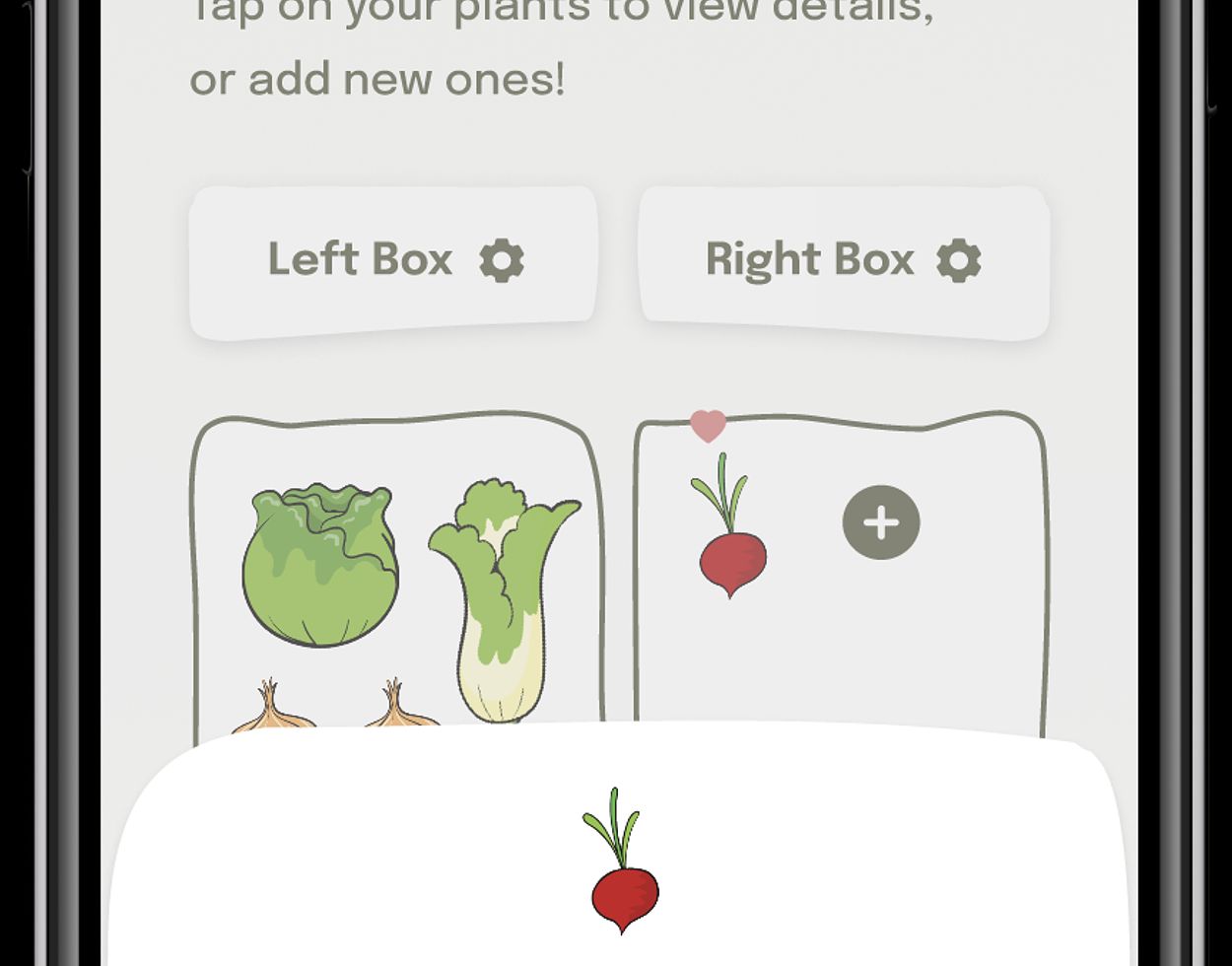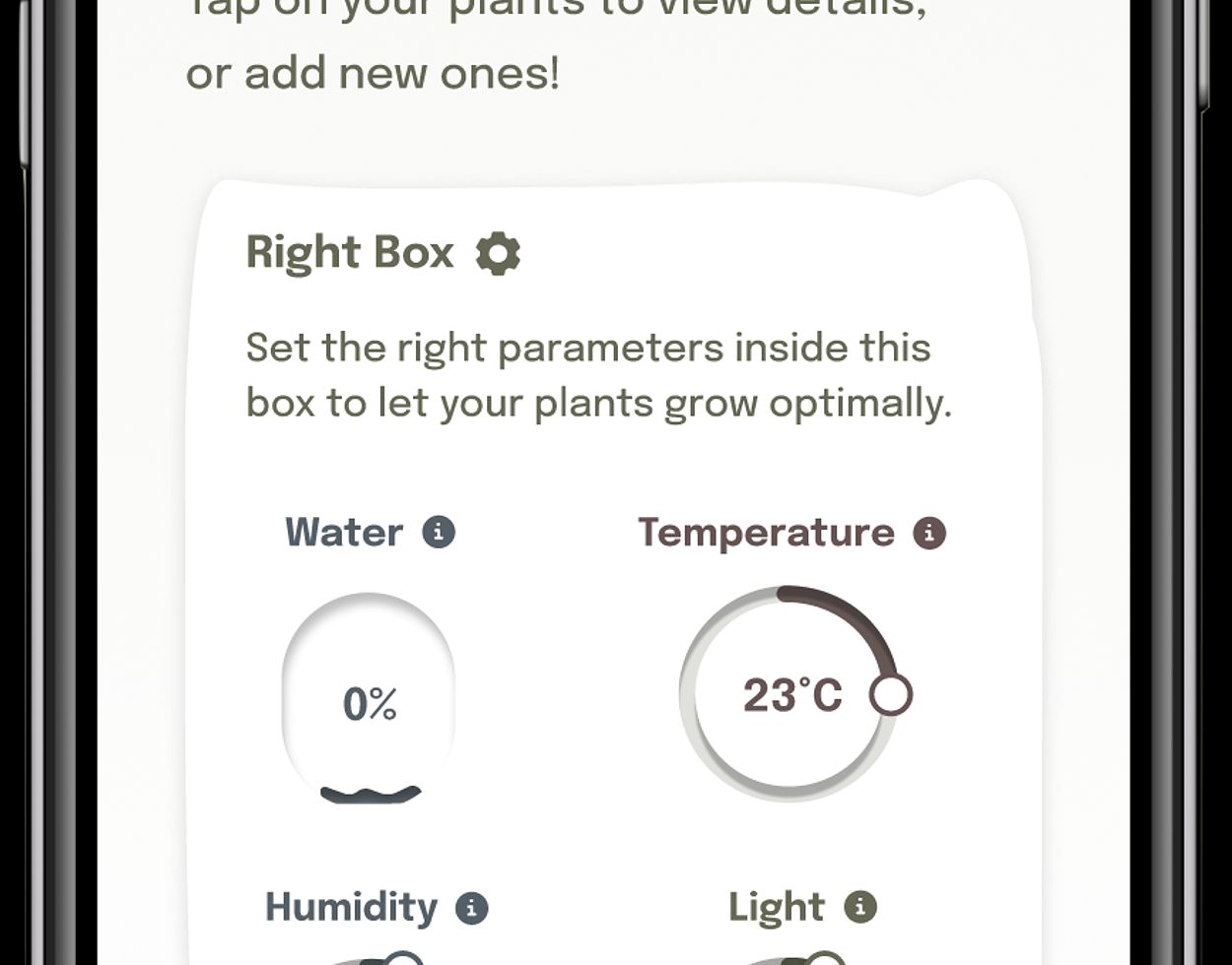 The app provides various possibilities to control the physical system. First of all, there are two-dimensional representations of the physical boxes and the plants within the boxes. Every new plant is first added digitally. The app has a huge plant database and can predict the plants needs for optimal growth. The app will guide the user to plant the plants through how to videos that can be watched. It will encourage the user to read through information sheets so that he/she knows about the plant's needs. The user can set the right environment for the plants (temperature, etc.) through sliders. Also, the app will give notifications about important events like watering or harvesting of plants. In general, the modul.Grow app provides users feedback on the status of their plant growth and on necessities that require the user’s attention. Some images of the prototype digital app can be seen below.