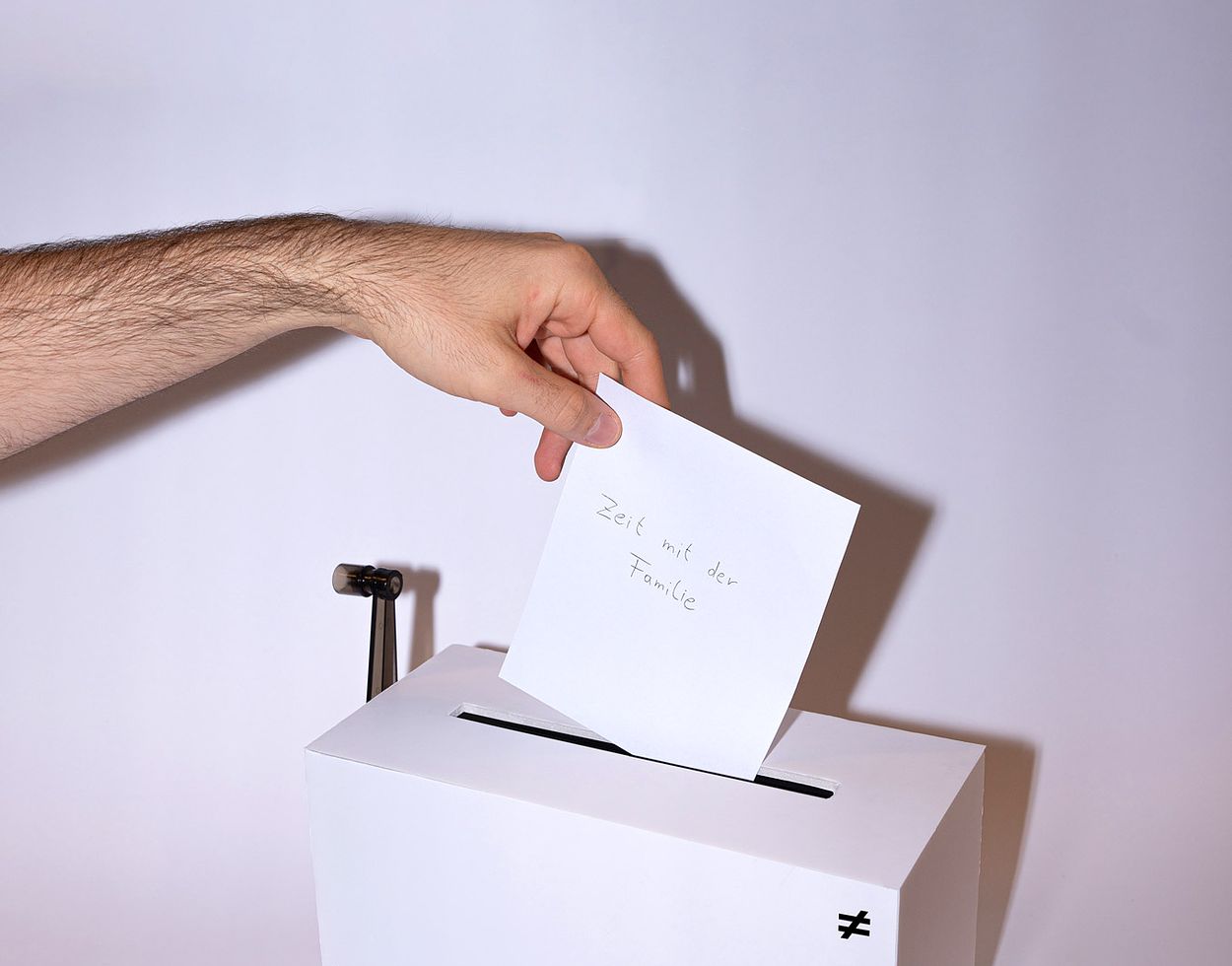 Mithilfe mehrerer kleinen interaktiven Installationen im öffentlichen Raum möchten wir die Aufmerksamkeit der Menschen gewinnen und Ihnen vor Augen führen, dass Sie nicht sich selbst gehören. Anschließend bitten wir Sie, an einem gemeinsamen Projekt, einer statistischen Erhebung teilzunehmen, bei der Sie Ihren eigenen Beitrag leisten können. Hierzu haben wir das Leben eines durchschnittlichen westeuropäischen Menschen genommen und dieses in vier Bereiche unterteilt: Arbeit, Familie, anderes und Zeit für sich selbst. Am Ende ergibt sich ein Gesamtbild, welches visualisiert, wie man seine Zeit investiert und welche Bereiche aufgrund anderer Prioritäten zurückstecken müssen.