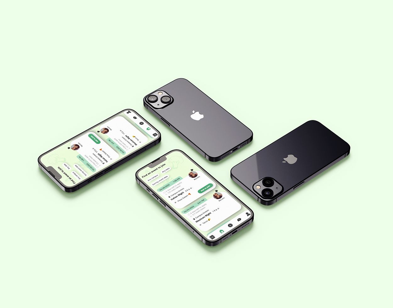 Auf der Startseite werden die Dinner-Events der aktuellen Woche angezeigt. Dabei gibt es Filter-Möglichkeiten nach Standort/Umkreis, Essenskategorie, Kosten, Datum und weitere Tags (vegetarisch, glutenfrei...). Die Dinner-Events werden mit den wichtigsten Infos angezeigt, und es gibt die Möglichkeit, direkt an den Veranstalter eine Anfrage zu senden. Für nähere Informationen kann auf ein Dinner-Event geklickt werden, um weitere Details zu sehen.