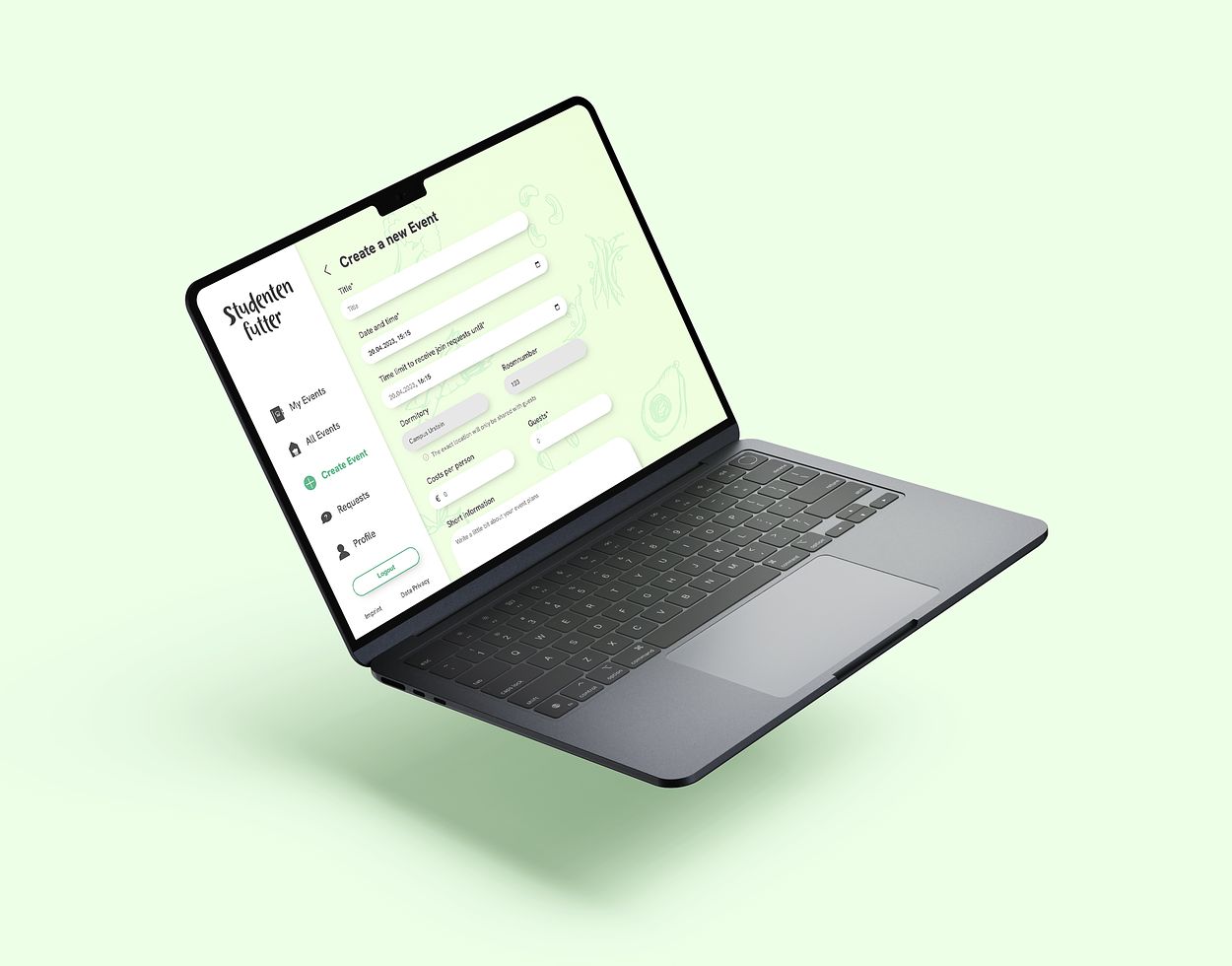 Wenn man sich dazu entscheidet ein Dinner-Event zu veranstalten, wird ein neues Event erstellt. Dabei werden Informationen wie Gericht, Personenanzahl, Kosten, Datum/Uhrzeit und Standort angegeben. Zusätzlich werden auch Tags für vegan, vegetarisch, glutenfrei usw. hinterlegt.