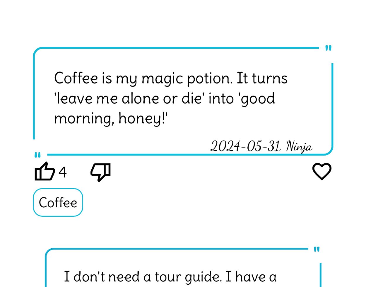 So give it a try, it's worth the effort! On the one hand, you can filter the stored posts by topic and display the jokes of your choice. These can be liked, disliked or added to your favourites so that you can call them up again at any time. On the other hand, you can of course also create your own posts, display them separately at any time and delete them again if necessary.
