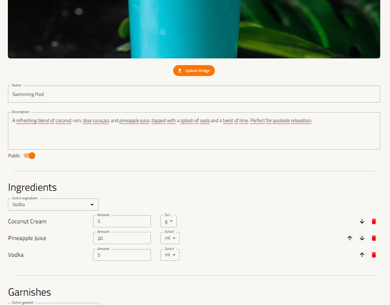 Users can create their own cocktails by selecting from a variety of ingredients. Users can choose from the base spirit to the various mixes and garnishes. The created cocktails can be saved and shared with other users.