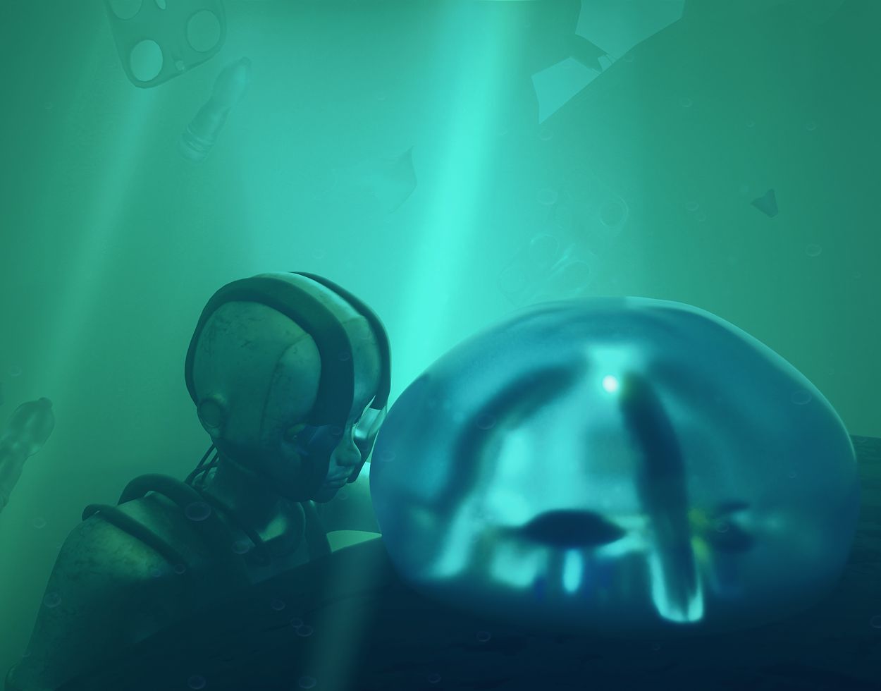 In this video, you will see a beautiful Underwater World. Within it lives a mermaid. But there is a twist. The mermaid lives within a big glass globe. Why? Because the outside world has been destroyed and is completely polluted. A lonely robot lives there. It observes the mermaid from the outside.