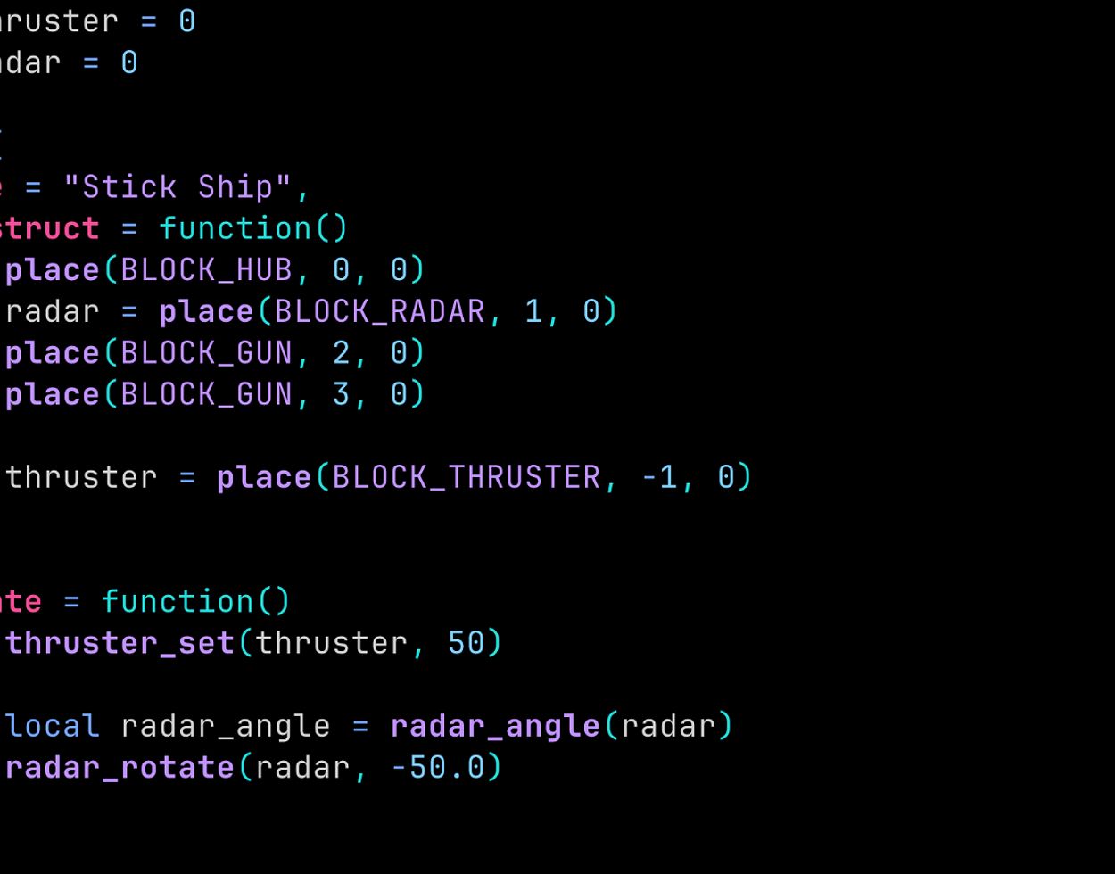 Lua-Based Ship Programming: Use a simple lua api to script ship movement, combat tactics, and environmental scanning. Build your own Spaceship: Build your ship from code, placing thrusters, radars, and weapons where you want. Autonomous Space Combat: Deploy multiple ships in the sandbox and watch as they fight for survival. Created as part of the 12th MMarmelade Game Jam with the theme: Lost Signal