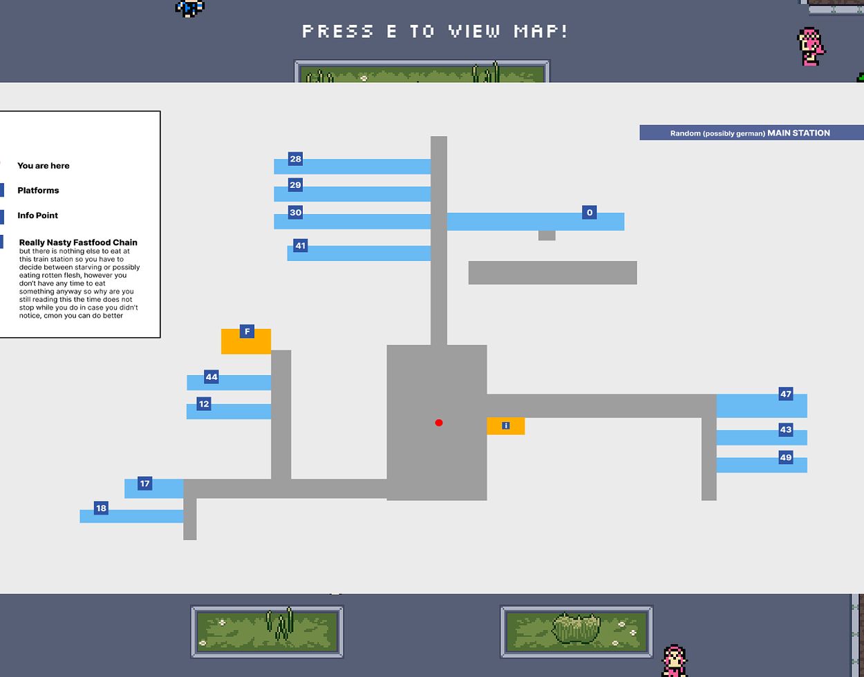 The game is presented in a Top-Down view. You have to navigate the player through the busy station, trying to avoid other passengers walking around. If you collide with them while sprinting, you will be slowed down, which can cost you precious seconds. The target platform is only shown in the beginning, so you better remember it. On the map in the centre of the station, the different platforms are labelled, so while you haven’t memorized the whole map yet, that’s how you know where to go. In combination with the timer, all of these things simulate the feeling of desperately trying to orientate yourself at a train station you have never been to before, while under time pressure.