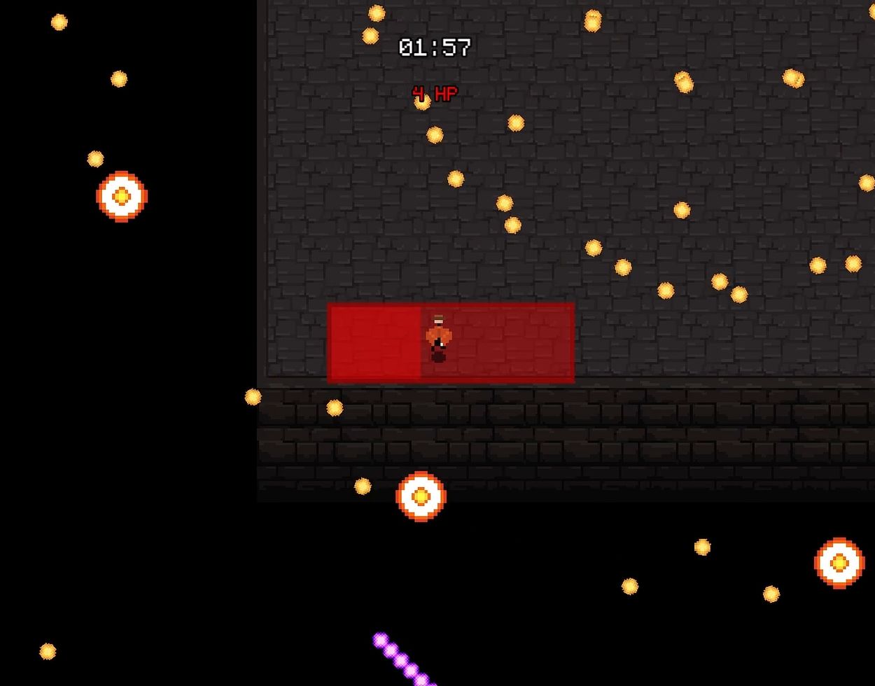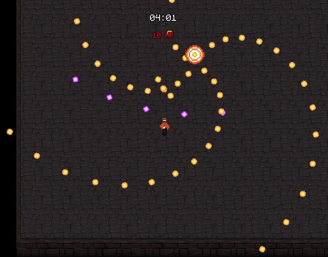In addition to regular eight-directional movement, there is a dodge roll mechanic that provides more options for evading attacks. It allows the player to roll through projectiles, ignoring their collision for a short time. However, each roll is followed by a brief exhaustion state that temporarily slows the player’s movement as a trade-off. While exhausted, the player cannot initiate another dodge roll until fully recovered.