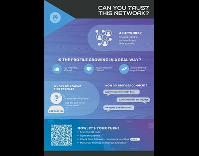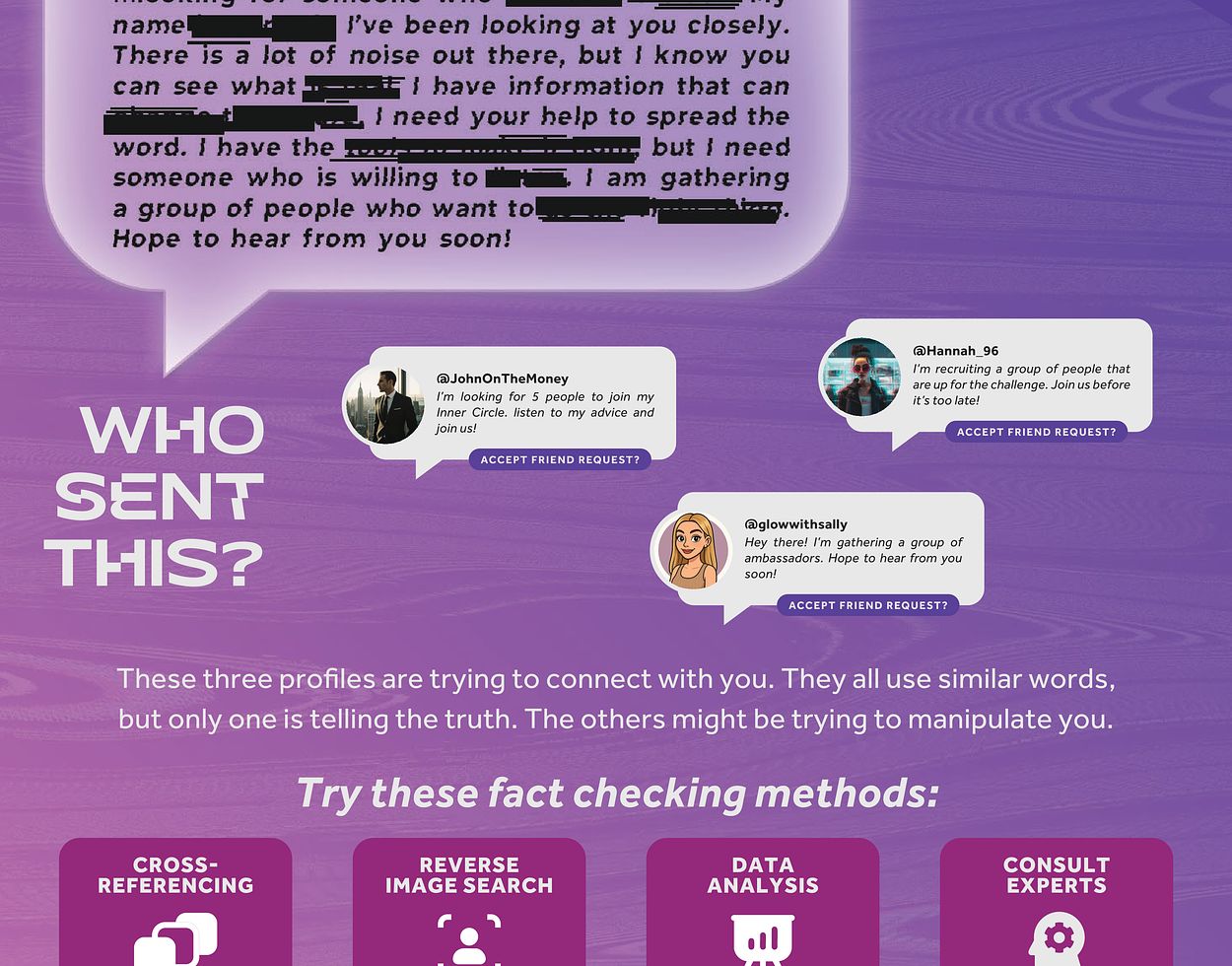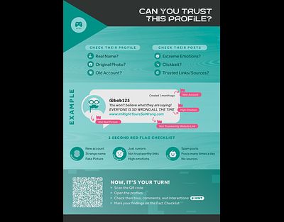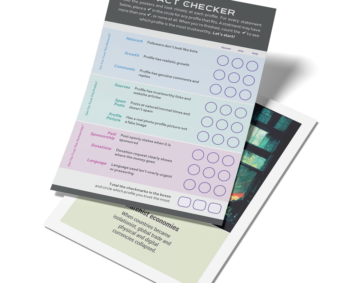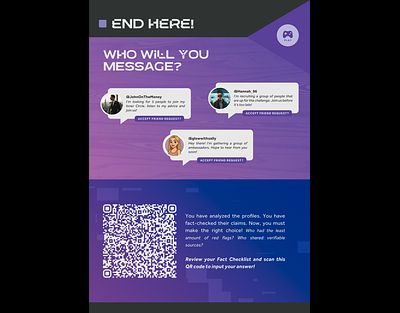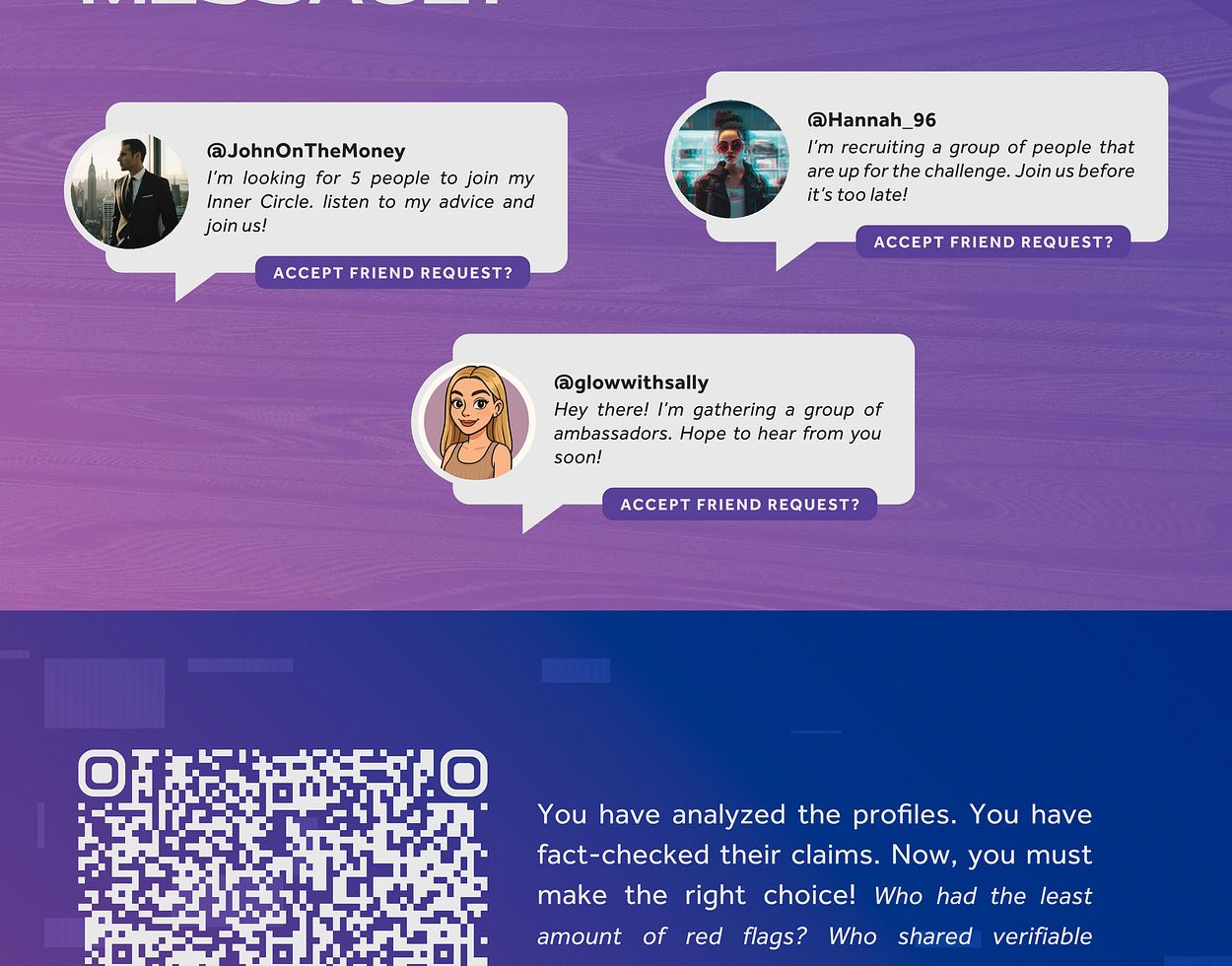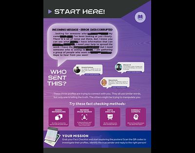 Players begin at the Start Poster, where they are introduced to the story of three social media profiles trying to connect with them. The characters are John (Financial Influencer), Sally (Wellness Promoter), and Hannah (Reverse History Hacker). Their task is to figure out which of these profiles is trustworthy. At this station, players also receive a fact checklist, which can be printed on the back of the Postcards from the Future. Players then visit the three content posters in any order. The posters focus on the topics: Partnerships, Networks and Source Credibility. After reading the information, players scan the QR at the bottom of each poster and apply what they have just learned by rating the profiles in each category. To keep track of their findings, they answer the questions on the fact checker. Once all content posters have been visited and the fact checklist is completed, players move to the Final Poster. There, they count the points for each character based on their answers. The character with the highest score is the most trustworthy. Players then select who they trust on their screen. If their choice is incorrect, an error message appears prompting them to try again or to go back to review the profiles. If they choose correctly, the chat with Hannah opens.