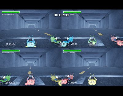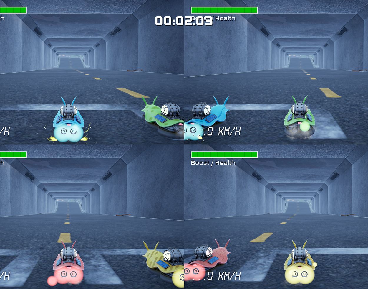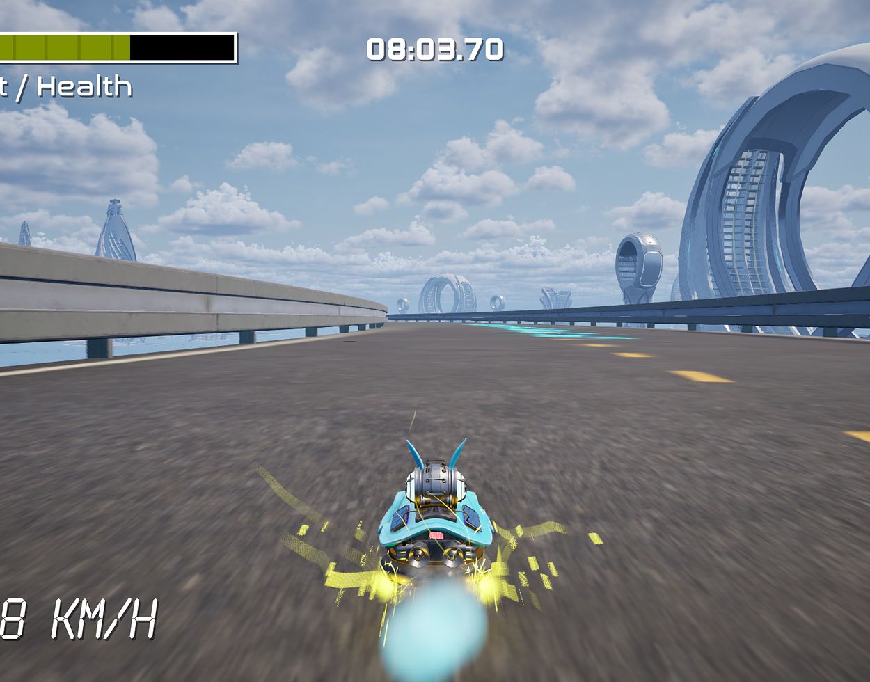 Route Omega is a local single- and multiplayer point racer where up to four players compete to be the first to reach the finish line. Players must strategically manage their Energy, which serves as both health and boost fuel - it depletes when boosting for extra speed or when opponents draft in their slipstream to steal it. Running out of Energy forces players to stop and recharge, adding a tactical layer to the high-speed competition. Visually, the game reflects the importance of this energy management by combining technology and nature in a solarpunk themed environment.